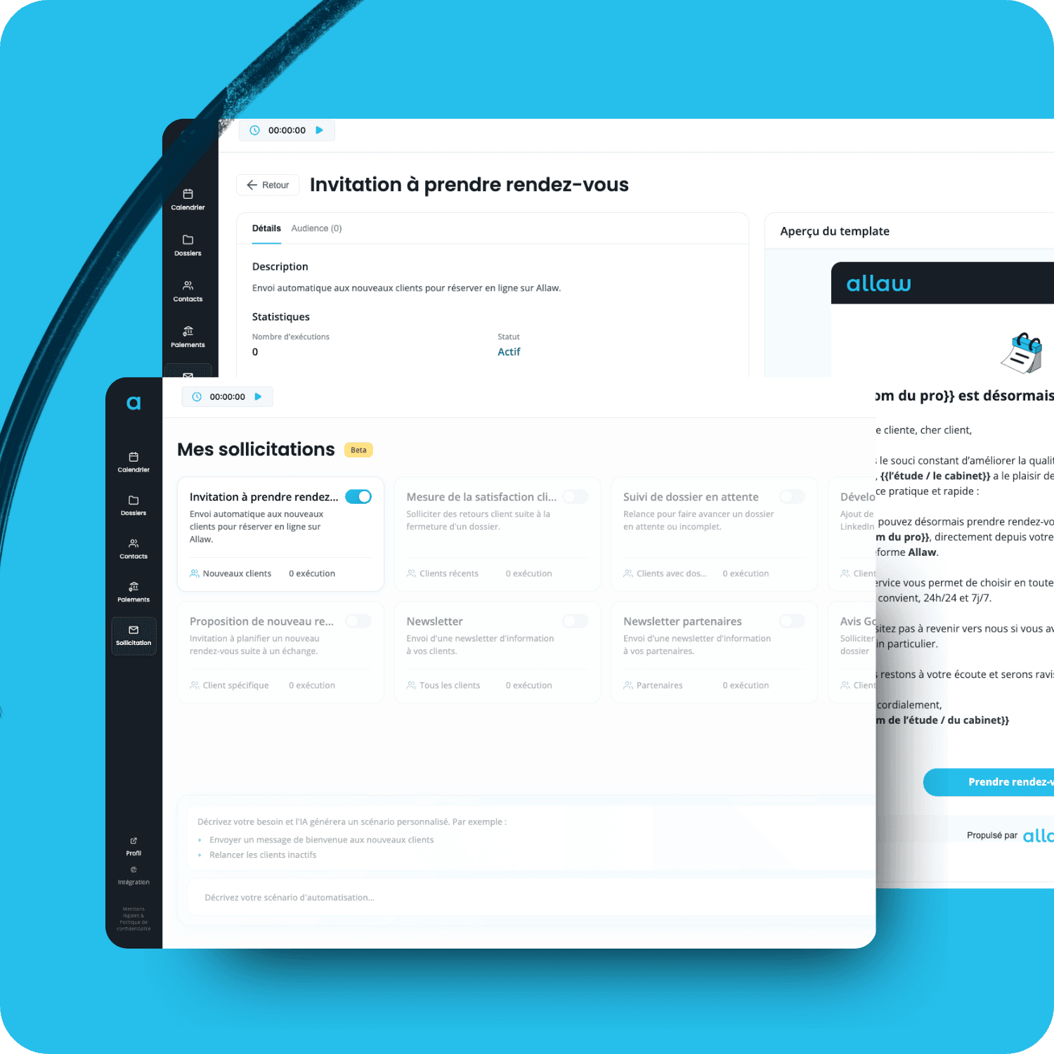 Entre organisation, clients exigeants et collaborateurs à coordonner, votre temps est compté. ALLAW vous aide à fluidifier l’essentiel, sans perdre le contrôle.